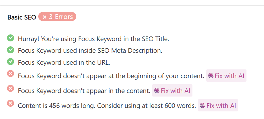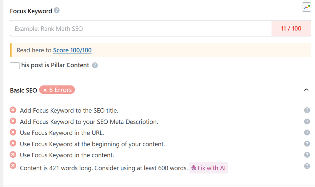 When you first create a post and have RankMath installed, you’ll see an SEO meta box in your editor. This box provides you with an initial score based on a series of basic checks. This is your baseline. As you can see in the image below, our post has an initial score of 11/100, and several checks are marked with a red cross, indicating areas where we can improve.