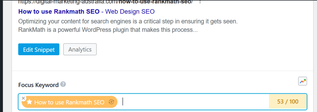 Your search snippet is what users see on Google’s search results page. It includes your post’s title, URL, and a short description. You can edit this directly in RankMath by clicking the “Edit Snippet” button. A modal window will appear, allowing you to customize your SEO title, permalink, and meta description. Make sure to include your focus keyword in both the title and description to improve your click-through rate.here is what i put- you will see it turn green when you have the optimum number of words
